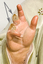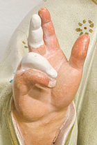 Zum Ersetzten der abgebrochenen Finger des Christuskindes wurden diese aus Gips modelliert und mit einem Skalpell in Form geschnitzt. Um die Stabilität zu erhöhen, wurden zuvor Holzstäbchen gesetzt, die den inneren Kern für die Gipsmasse bildeten.
